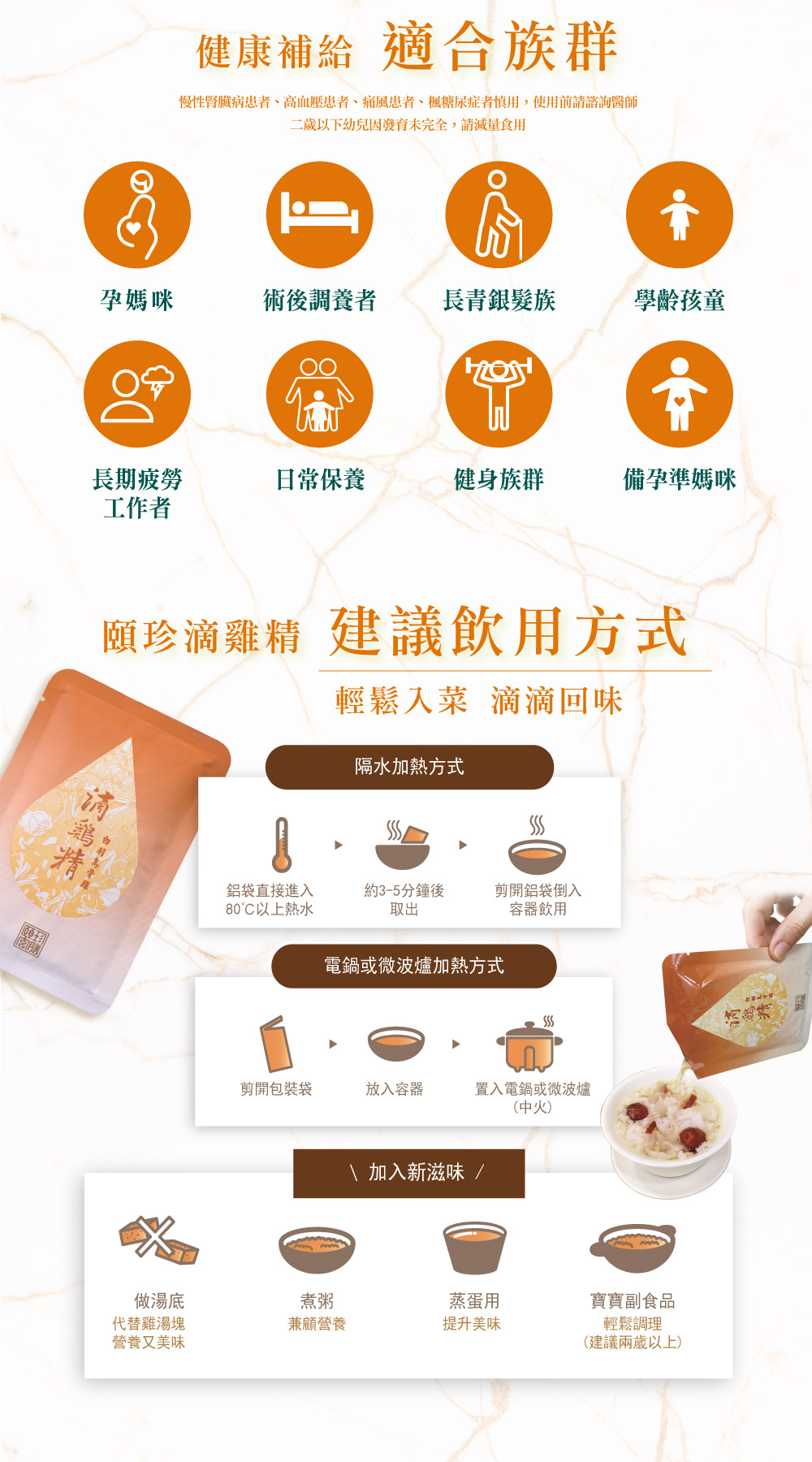 1. 慢性腎臟病患者、高血壓患者、痛風患者、楓糖尿症者慎用,使用前請諮詢醫師。