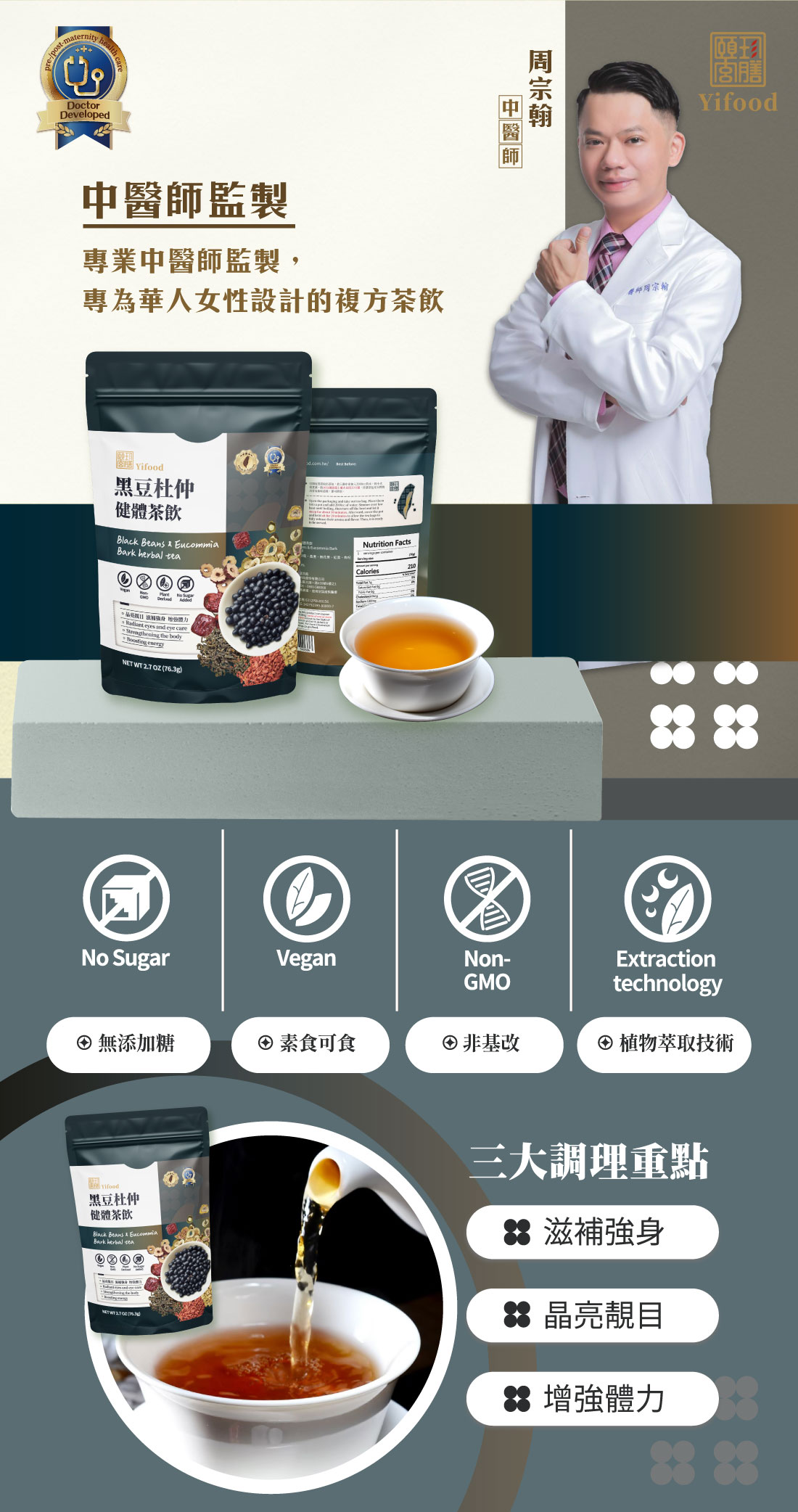 ■ 產品成份:黑豆、杜仲葉、黃耆、無花果、紅棗、枸杞 (Black soybean, eucommia leaf, Astragalus Root, Dry Common Fig, Jujube Fruit, Wolfberry Fruit)