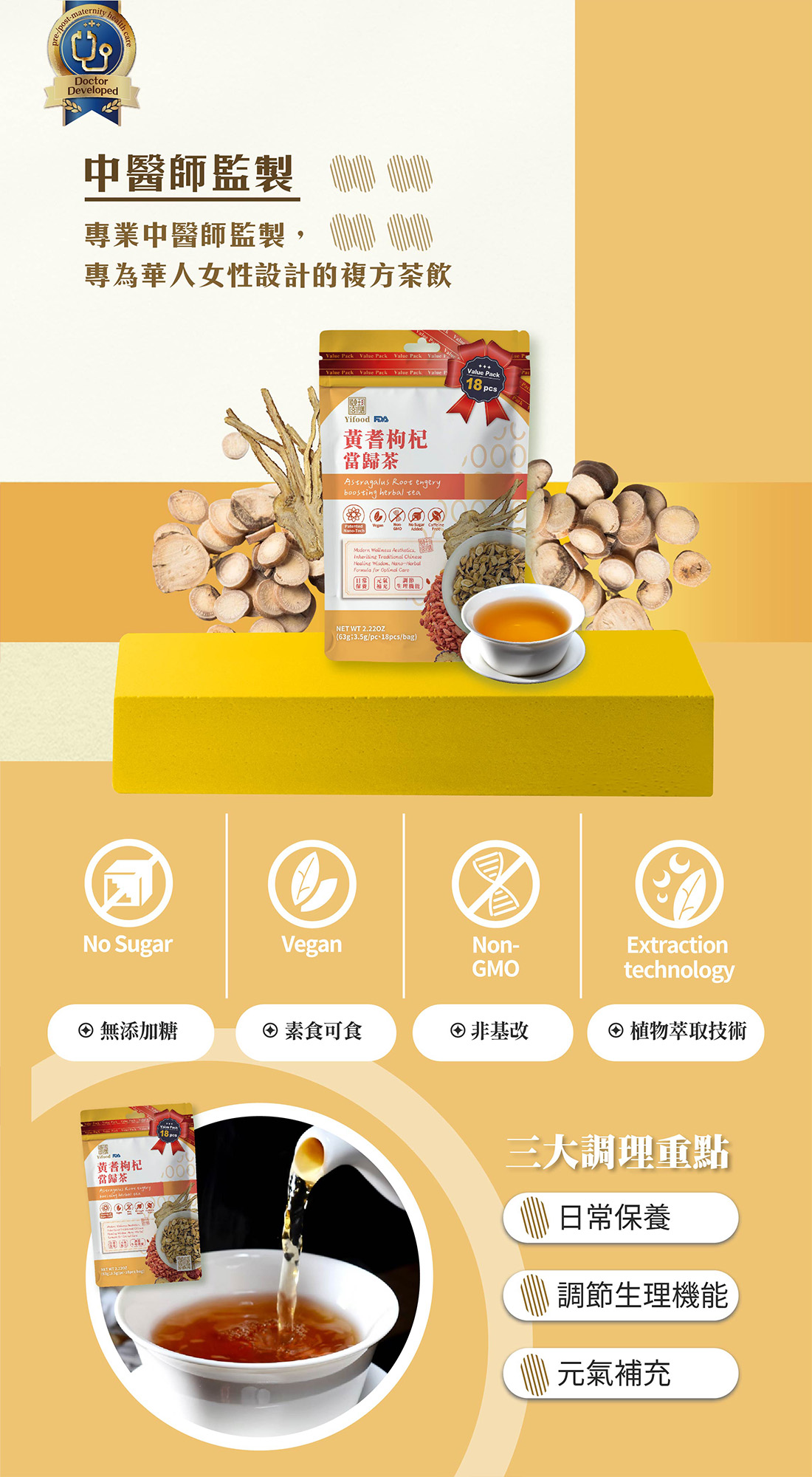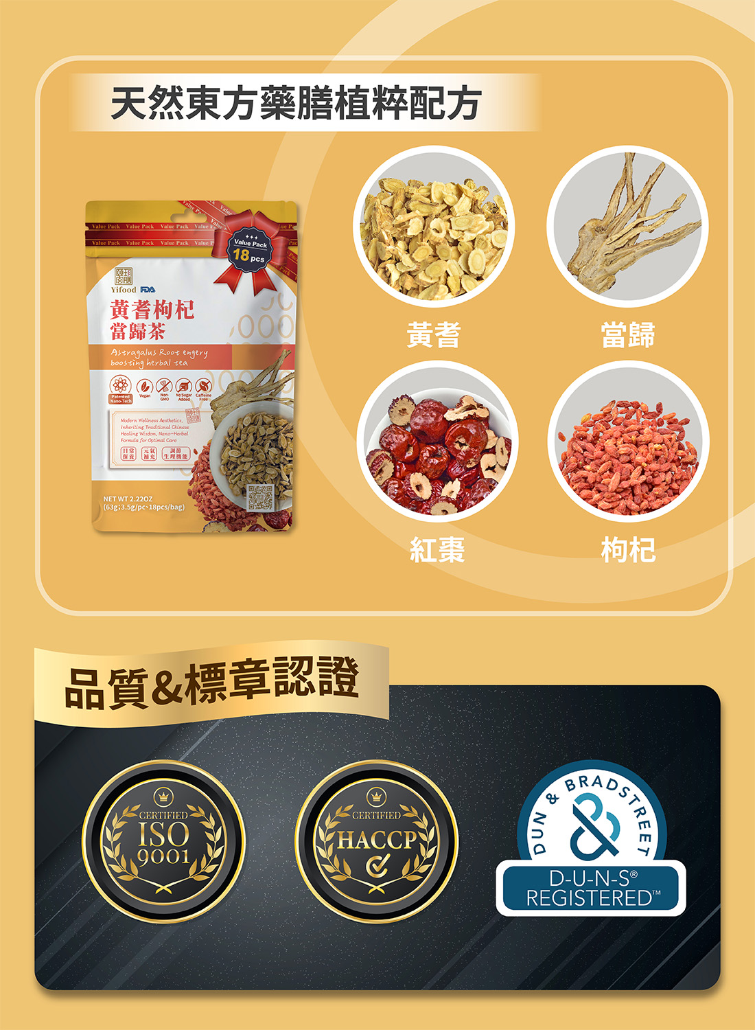 ■ 產品成份:黃耆、紅棗、枸杞、當歸(Scutellaria baicalensis, red dates, wolfberry, angelica)