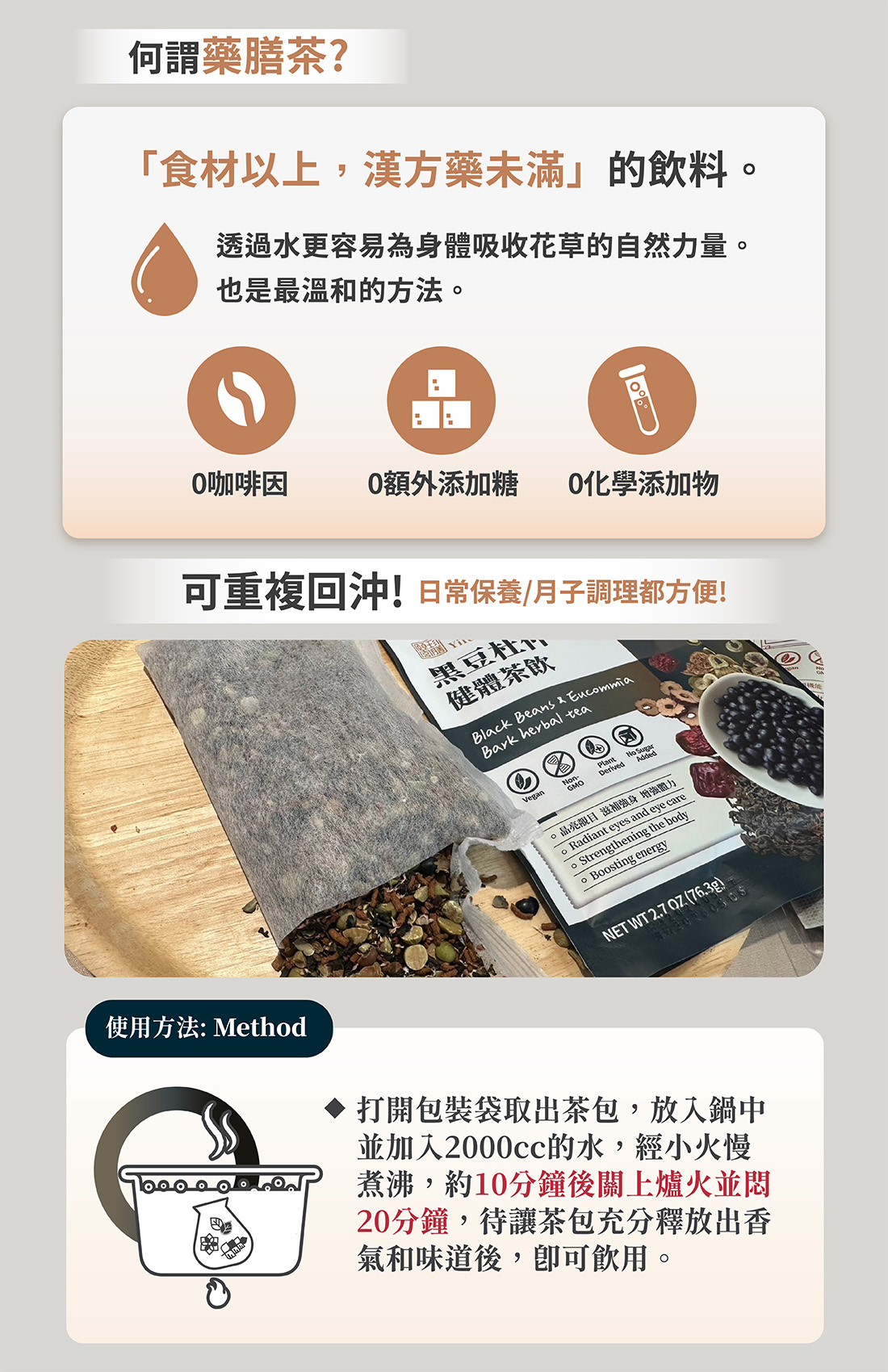 打開包裝袋取出“1份茶包”,放入杯子/瓶子中,加入500cc的熱水沖泡,約莫經3-5分鐘,讓茶包充分釋放出香氣和味道後,即可飲用。