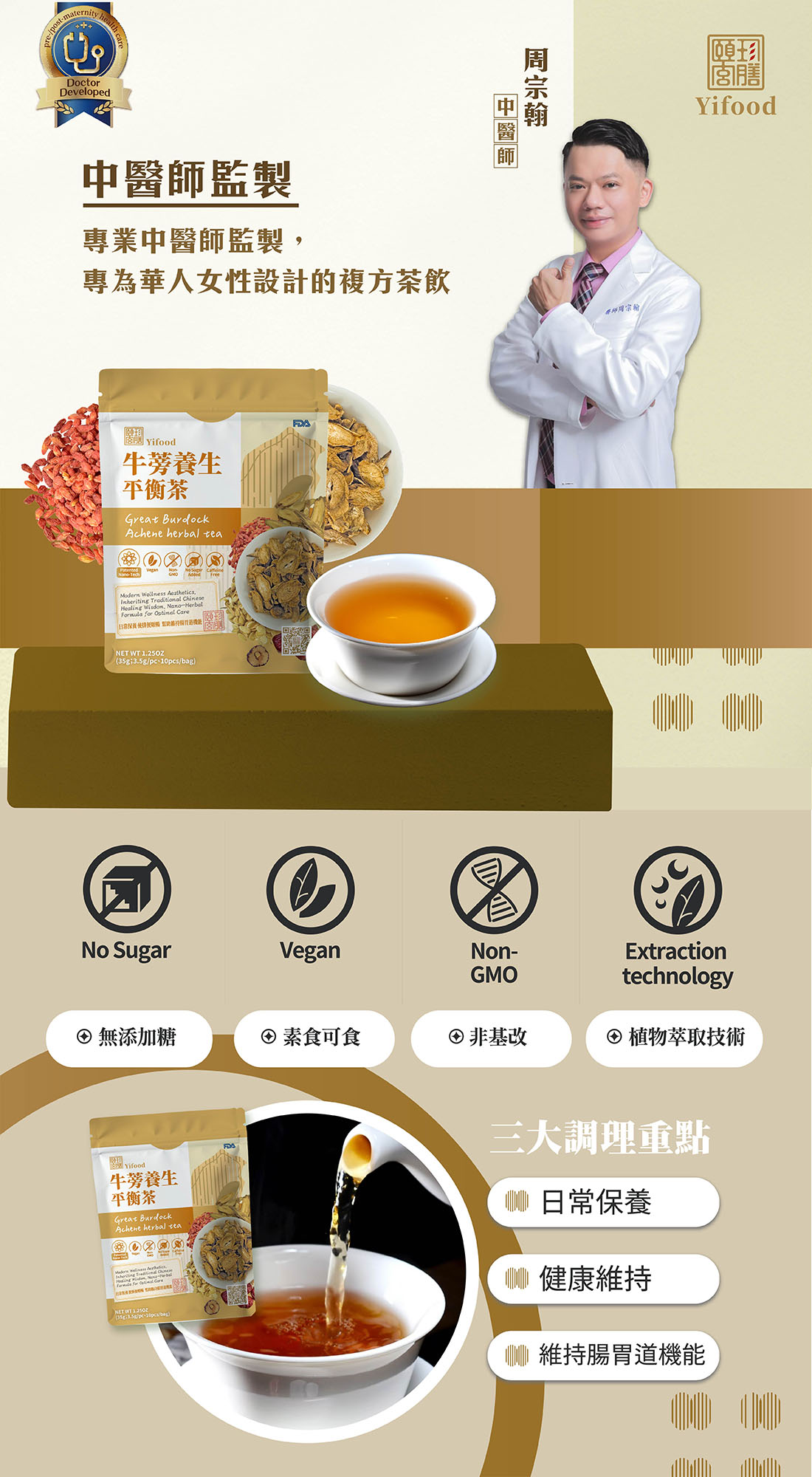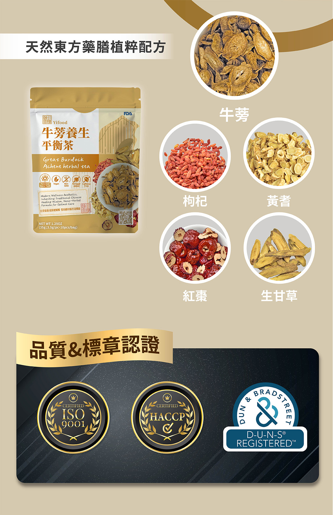 ■ 產品成份:牛蒡、黃耆、紅棗、 生甘草、枸杞 (Great Burdock, Astragalus Root, Jujube Fruit, Liquorice Root and Rhizome, Wolfberry Fruit)