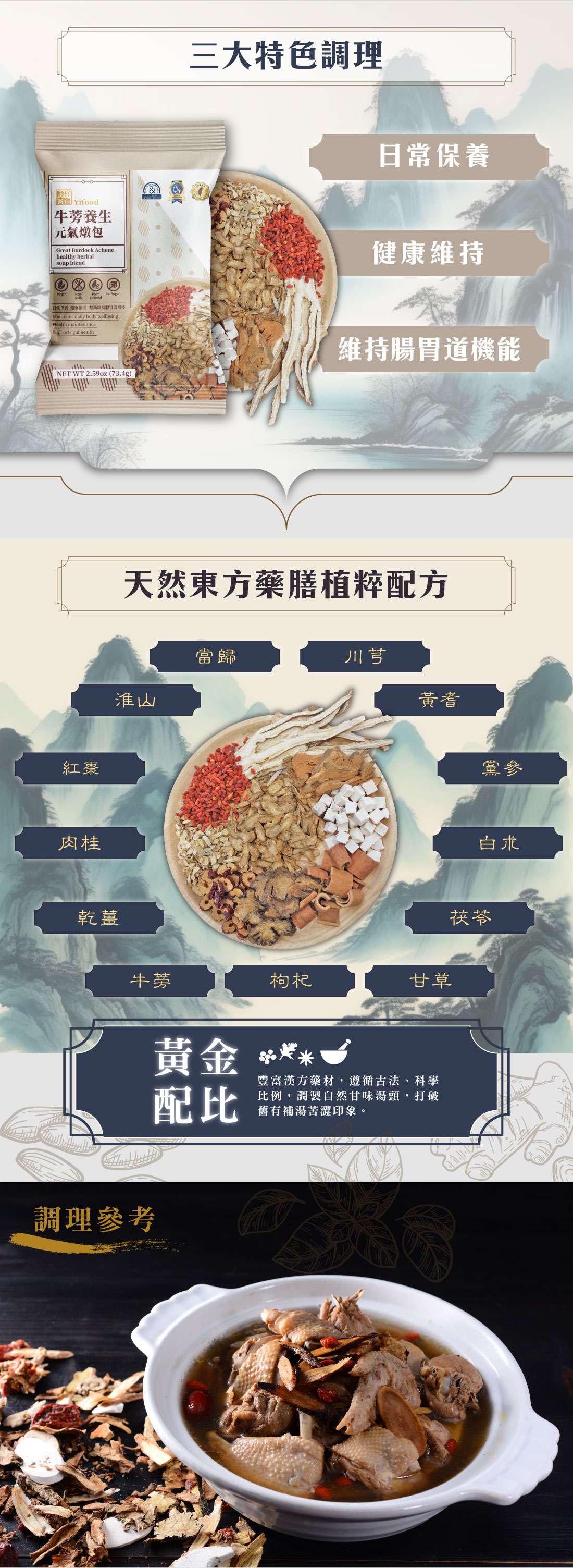 ■ 產品成份:牛蒡、乾薑、桂皮、紅棗、淮山、當歸、黃耆、黨蔘、白朮、茯苓、甘草、川芎、枸杞